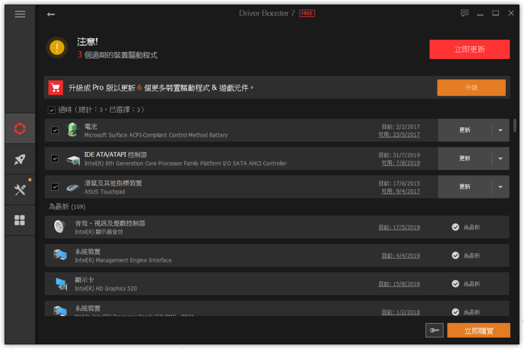 這個免費軟體 Iobit Driver Booster 就可以幫我們代勞更新過時的軟件。首先會列出目前已安裝在電腦中的全部硬體,再比對已安裝的驅動程式版本及原廠網站提供的最新版本,如果有需要的話會提示讓我們更新。除了手動更新之外也提供了全自動更新驅動程式的功能只要按一下便可快速完成。