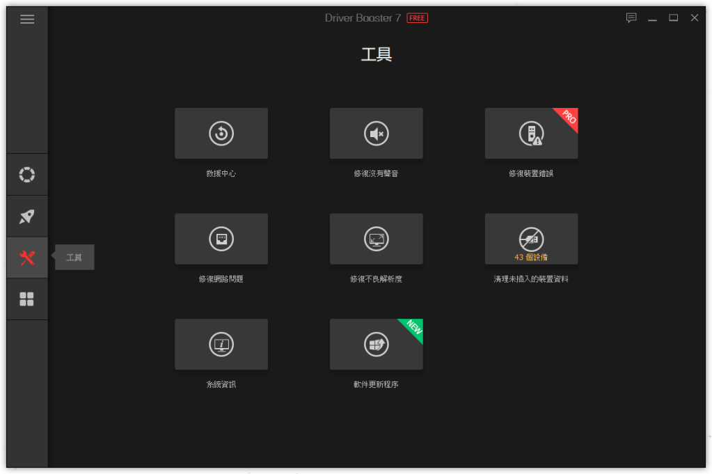 此外,「工具」可供修復之用。如果更新後發現問題, 可從左上方「救援中心」中找回驅動程式備份,可令程式回復至上一個版本。另外還可修復不良解析度、沒有聲音、網路問題,清理未插入的裝置資料等等。