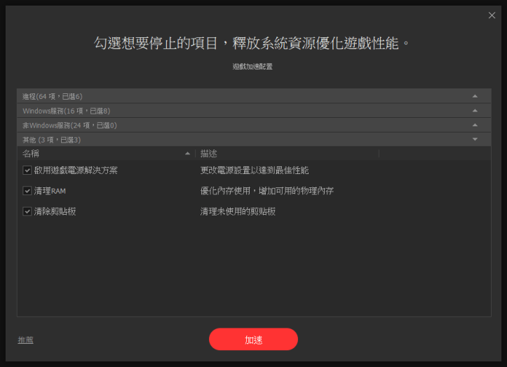 除更新功能外,還提供「加速」功能,包括遊戲加速及系統最佳化,會智能分析系統進程,可勾選並關閉遊戲中不必要的項目,進行內存優化及協助清理未使用的剪貼板。